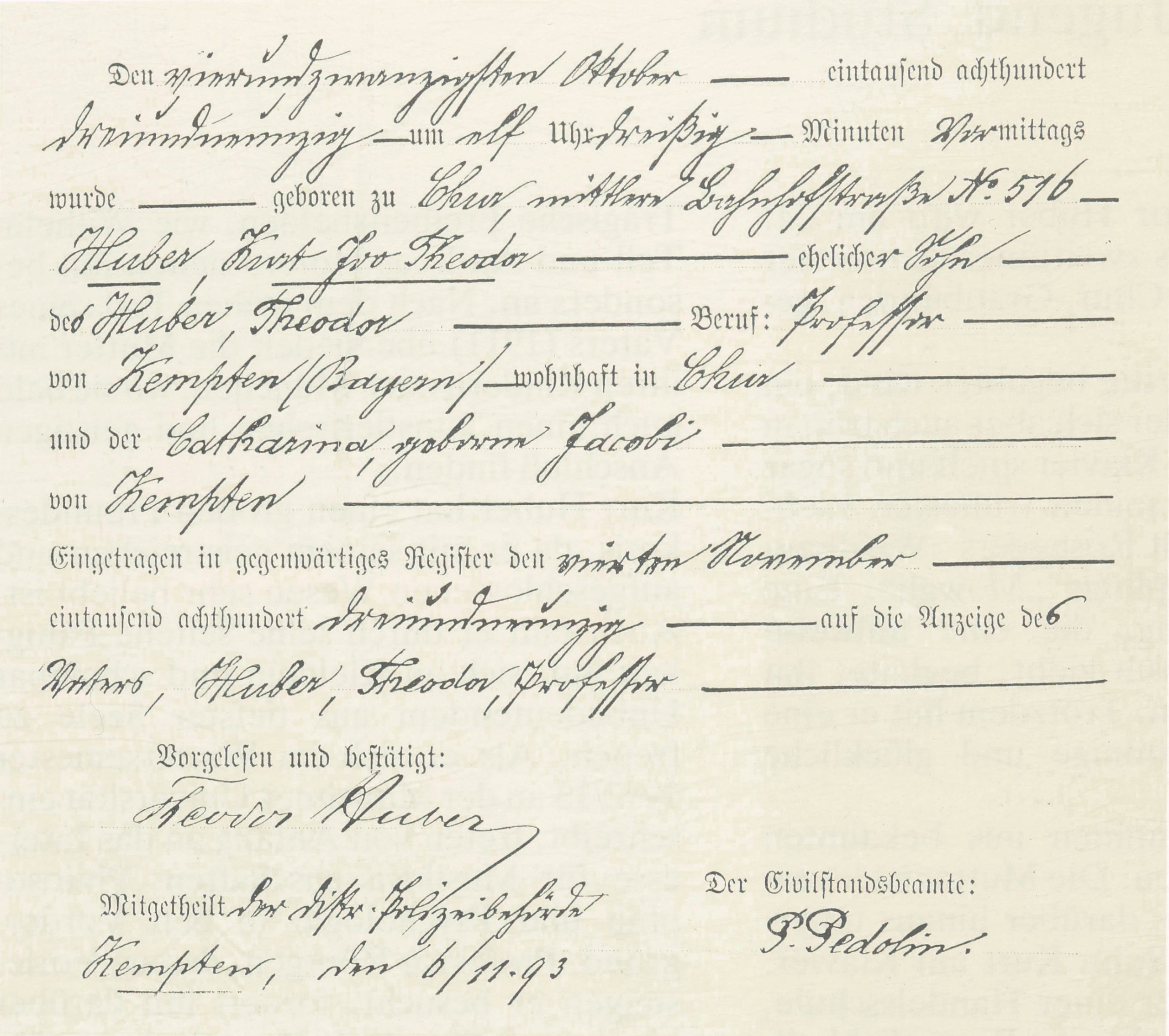 Eitragung in das Geburtsregister der Stadt Chur