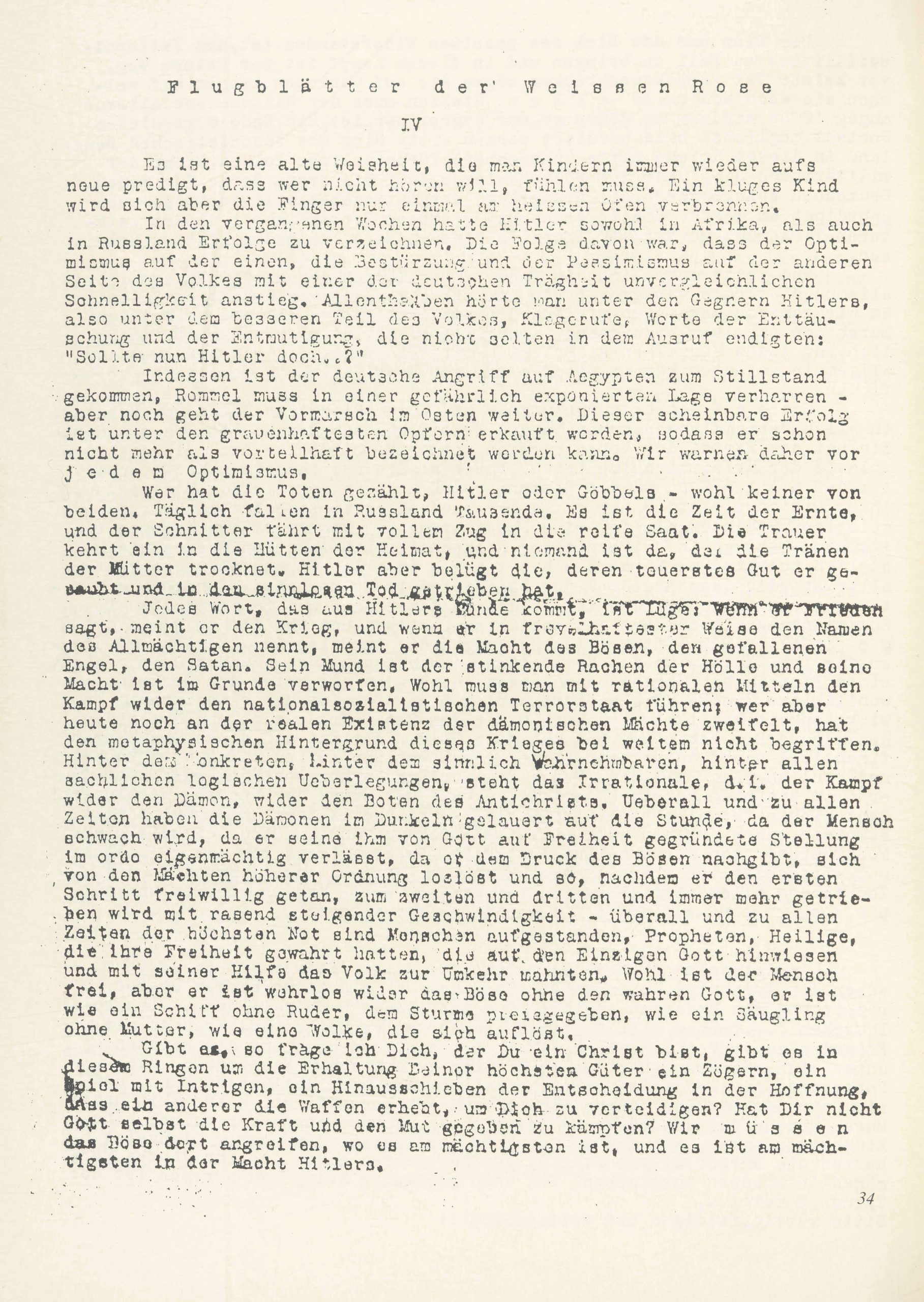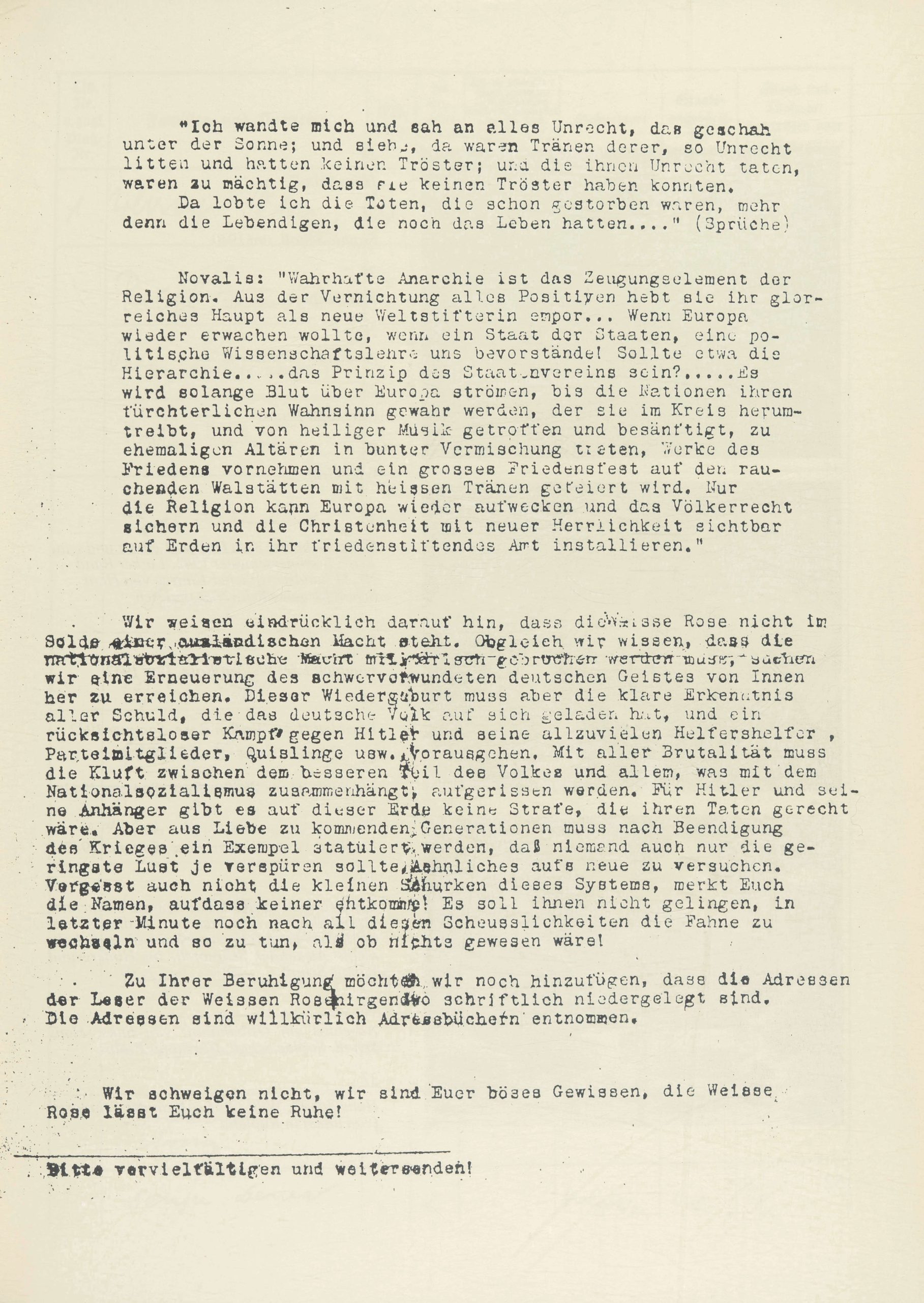 Wir weisen ausdrücklich darauf hin, dass die Weisse Rose nicht im Solde einer ausländischen Macht steht. Obgleich wir wissen, dass die nationalsozialistische Macht militärisch gebrochen werden muss, suchen wir eine Erneuerung des schwerverwundeten deutschen Geistes von Innen her zu erreichen. Dieser Wiedergeburt muss aber die klare Erkenntnis aller Schuld, die das deutsche Volk auf sich geladen hat, und ein rücksichtsloser Kampf gegen Hitler und seine allzuvielen Helfershelfer, Parteimitglieder, Quislinge usw. vorausgehen. Mit aller Brutalität muss die Kluft zwischen dem besseren Teil des Volkes und allem, was mit dem Nationalsozialismus zusammenhängt, aufgerissen werden. Für Hitler und seine Anhänger gibt es auf dieser Erde keine Strafe, die ihren Taten gerecht wäre. Aber aus Liebe zu kommenden Generationen muss nach Beendigung des Krieges ein Exempel statuiert werden, daß niemand auch nur die geringste Lust je verspüren sollte, Ähnliches aufs neue zu versuchen. Vergesst auch nicht die kleinen Schurken dieses Systems, merkt euch die Namen, auf dass keiner entkomme! Es soll ihnen nicht gelingen, in letzter Minute noch nach diesen Scheusslichkeiten die Fahne zu wechseln und so zu tun, als ob nichts gewesen wäre!