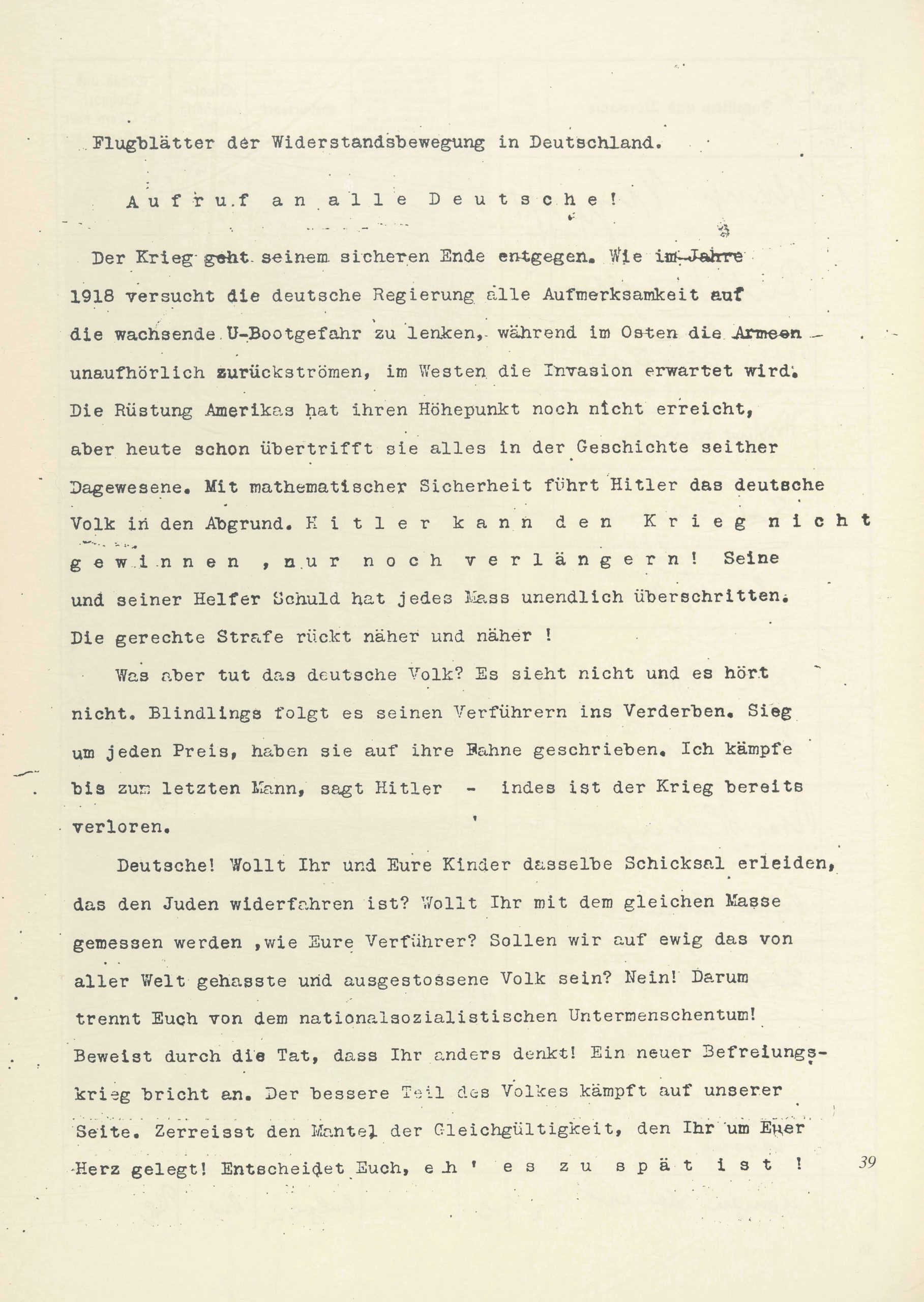 Deutsche! Wollt Ihr und Eure Kinder dasselbe Schicksal erleiden, das den Juden widerfahren ist? Wollt Ihr mit dem gleichen Masse gemessen werden, wie Eure Verführer? Sollen wir auf ewig das von aller Welt gehasste und ausgestossene Volk sein? Nein! Darum trennt Euch von dem nationalsozialistischen Untermenschentum! Beweist durch die Tat, dass Ihr anders denkt! Ein neuer Befreiungskrieg bricht an. Der bessere Teil des Volkes kämpft auf unserer Seite. Zerreisst den Mantel der Gleichgültigkeit, den Ihr um Euer Herz gelegt! Entscheidet Euch, e h ‚ e s z u s p ä t i s t !