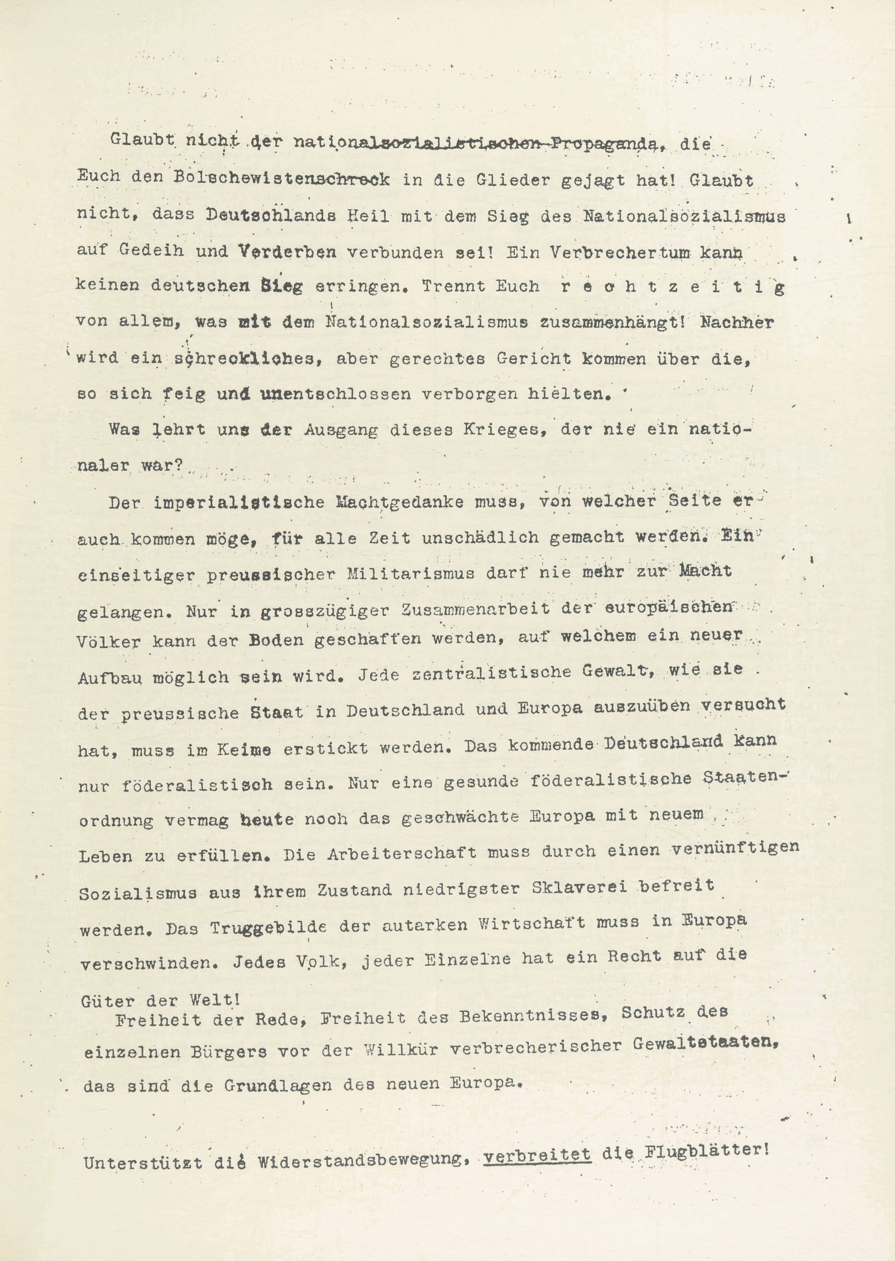 Glaubt nicht der nationalsozialistischen Propaganda, die Euch den Bolschewistenschreck in die Glieder gejagt hat! Glaubt nicht, dass Deutschlands Heil mit dem Sieg des Nationalsozialismus auf Gedeih und Verderben verbunden sei! Ein Verbrechertum kann keinen deutschen Sieg erringen. Trennt Euch r e c h t z e i t i g von allem, was mit dem Nationalsozialismus zusammenhängt! Nachher wird ein schreckliches, aber gerechtes Gericht kommen über die, so sich feig und unentschlossen verborgen hielten.