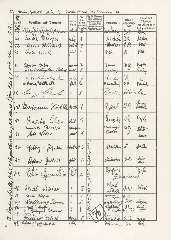 Veranlasst durch die einschneidende Intrige Herbert Gerigks, die – wie schon berichtet -, den Karriereabbruch des Berliner Unternehmens bedeutete, ließ Hubers Frau Clara, seine „energische Mitarbeiterin“, wie er sie in einer Widmung seiner Volksliederausgabe nannte, aktiv werden. Im Jahr 1940 stellt sie beim Gräfelfinger Ortsgruppenleiter für ihren Mann den Antrag auf Aufnahme in die NSDAP. Postwendend verbessern sich nicht nur die finanziellen Verhältnisse der nach der Geburt des Sohnes Wolfgang nun vierköpfigen Familie, auch die Chancen bei der Wiedereingliederung Hubers an „seiner“ Universität stellten sich deutlich verbessert dar, so dass das Schlimmste vorerst abgewendet werden kann.